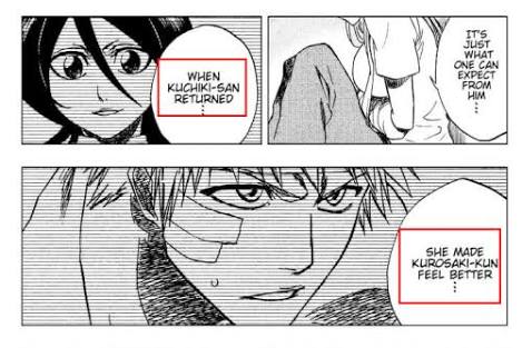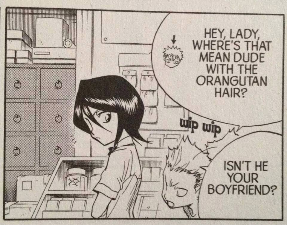 Going back to the whole thing, Rukia saved him in Hueco Mundo and then she actually had to remind him that their goal was to save Orhime because HE WAS SO FUCKING GLAD TO SEE RUKIA.