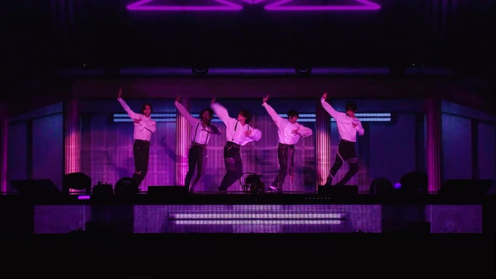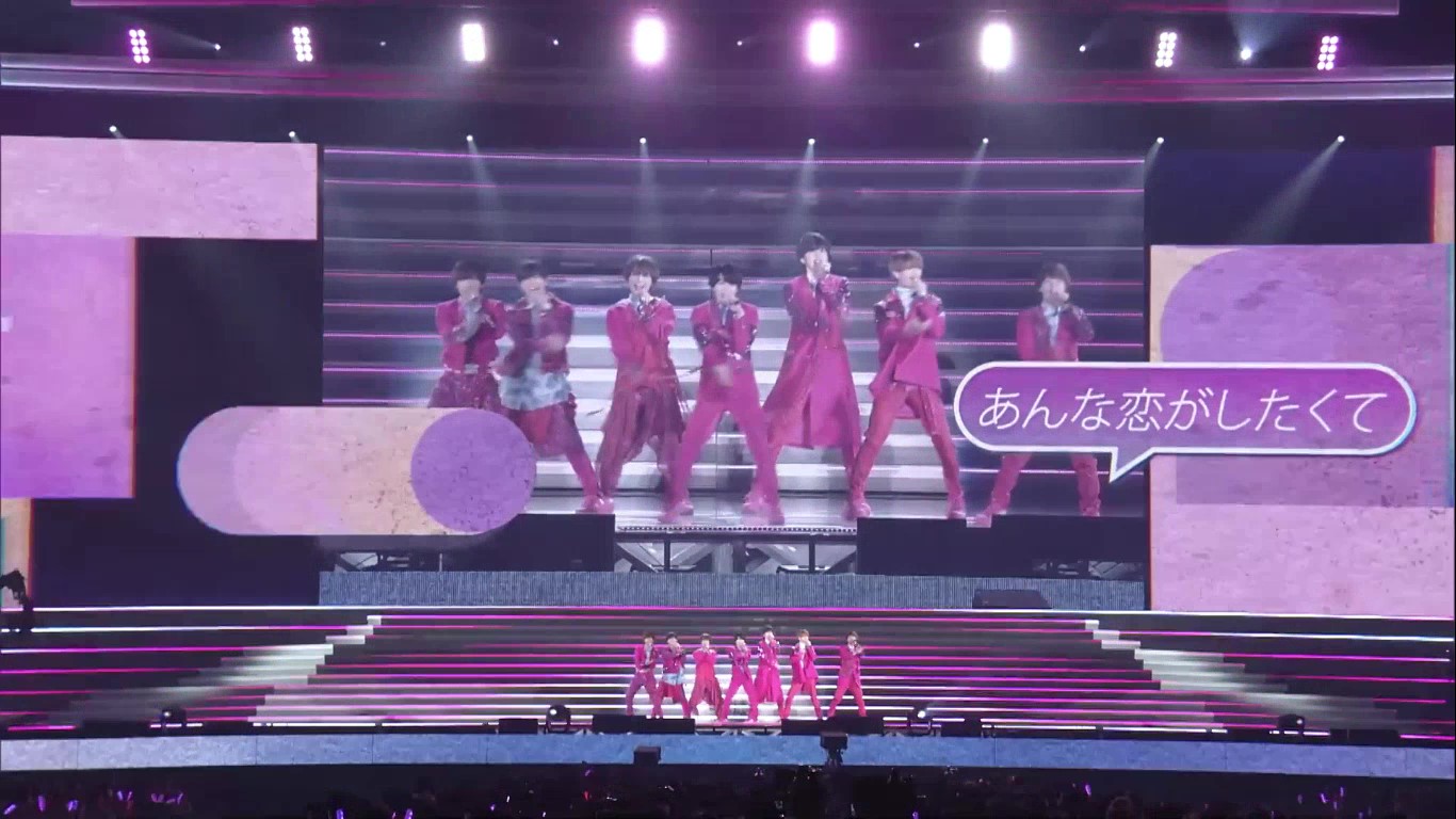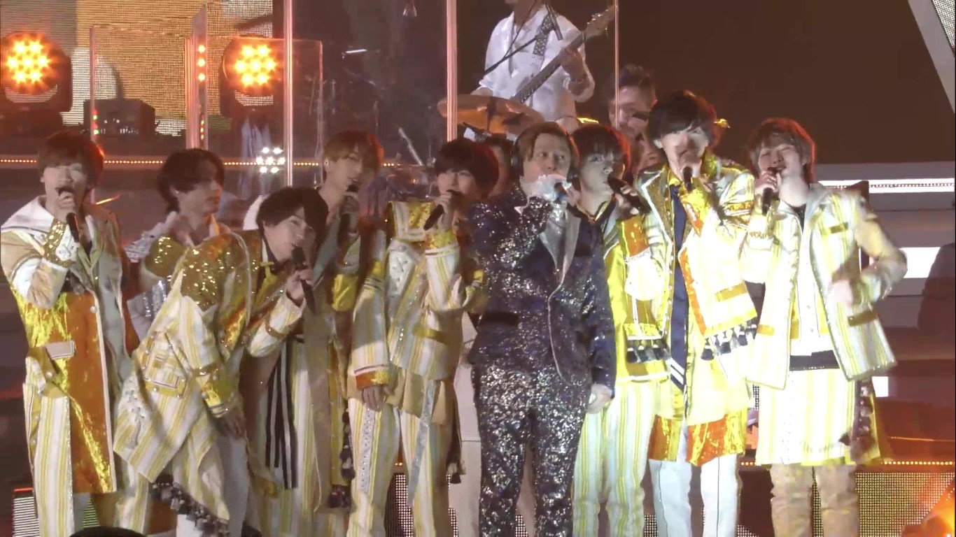 The reveal of their second costume during their entrance with Johnny’s WEST (ใธใฃใใผใบWEST) and Kanjani8 (้ขใธใฃใโ) felt like such a let-down. It would’ve actually looked a lot better if they’d just ditched their hot pink jackets from their first appearance offstage before they came in on the moving stage cars.