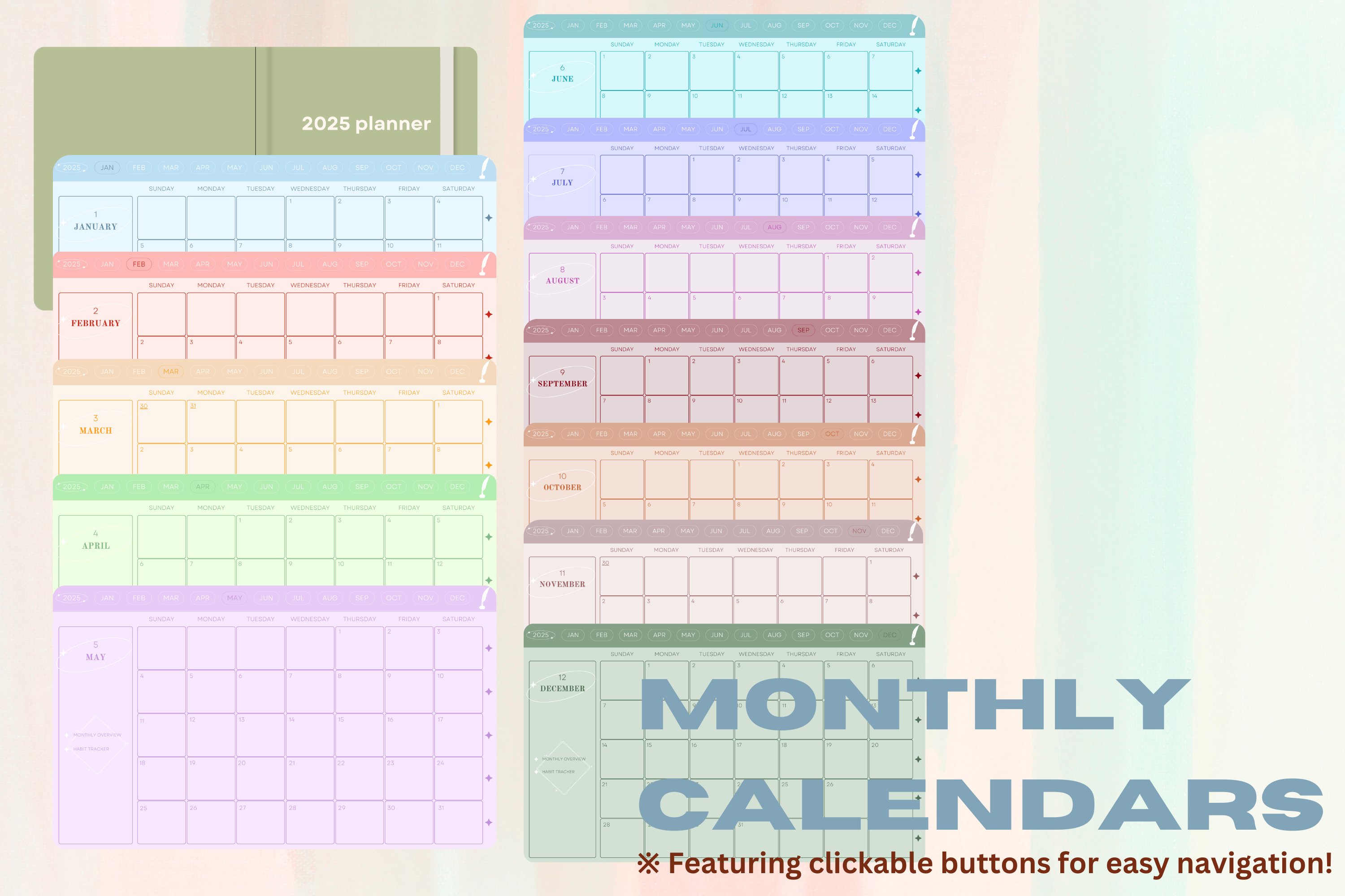I’m also thrilled to announce that this planner is also incredibly user-friendly. I’m proud to inform you that every single page of this journal features buttons for easy navigation. Each page not only features a ‘2025’ button that will take you directly to the yearly overview page, but they also feature buttons to easily jump through to any and all of the 12 months โ so you can quickly and seamlessly plan out your 2025 to best keep track of everything.